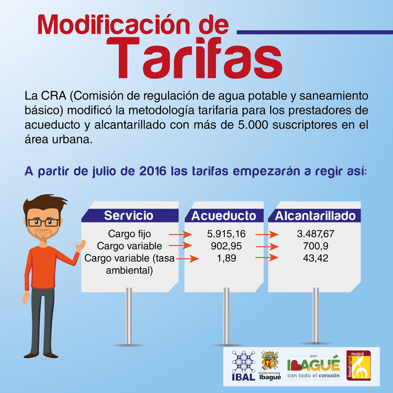 El IBAL S.A. E.S.P. OFICIAL al igual que los demás prestadores de servicios públicos domiciliarios de acueducto y alcantarillado del país, implementará el nuevo marco tarifario autorizado por la CRA (Comisión de Regulación de Agua Potable y Saneamiento Básico), a través de la resolución 735 de 2015.