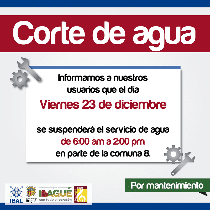 Con el objetivo de ejecutar trabajos de reparación en la tubería de conducción de la avenida Ambalá hacia el tanque ubicado en la zona del Vergel. La Empresa Ibaguereña de Acueducto y Alcantarillado IBAL informa que este viernes 23 de diciembre se suspenderá el servicio en algunos barrios de la comuna ocho.