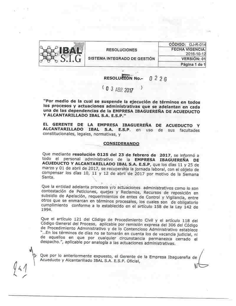 Resolución N. 0226 de 2017 ” Por medio de la cual se suspende la ejecución de términos en todos los procesos y actuaciones administrativas que se adelantan en cada una de las dependencias del IBAL SA ESP OFICIAL”
