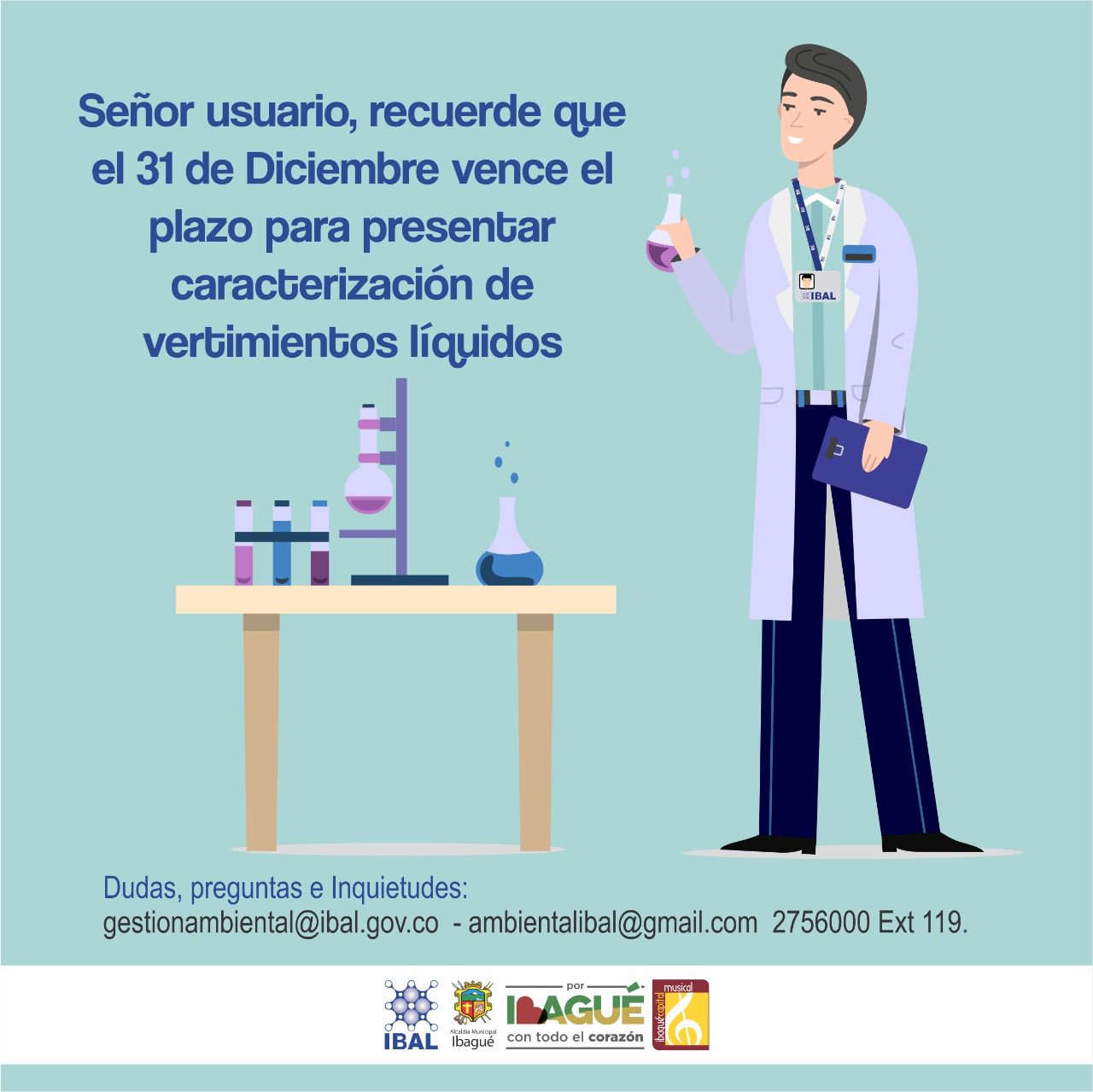 La Empresa Ibaguereña de Acueducto y Alcantarillado – IBAL se permite informar a los usuarios clasificados como uso comercial, industrial oficial o especial y que generen vertimientos de aguas residuales no domésticas que, hasta el 31 de diciembre del presente año, se tiene como máximo plazo para presentar la caracterización fisicoquímica y microbiológica de sus efluentes, teniendo en cuenta los parámetros establecidos en la Resolución MADS No.631 de 2015.