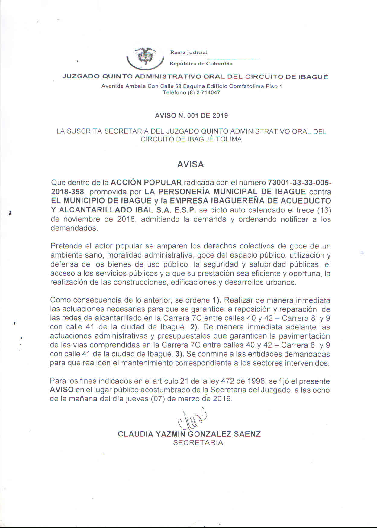 Aviso Juzgado quinto Administrativo de Ibagué, Acción Popular de Personeria Municipal de Ibagué contra la Empresa IBAL SA ESP OFICIAL