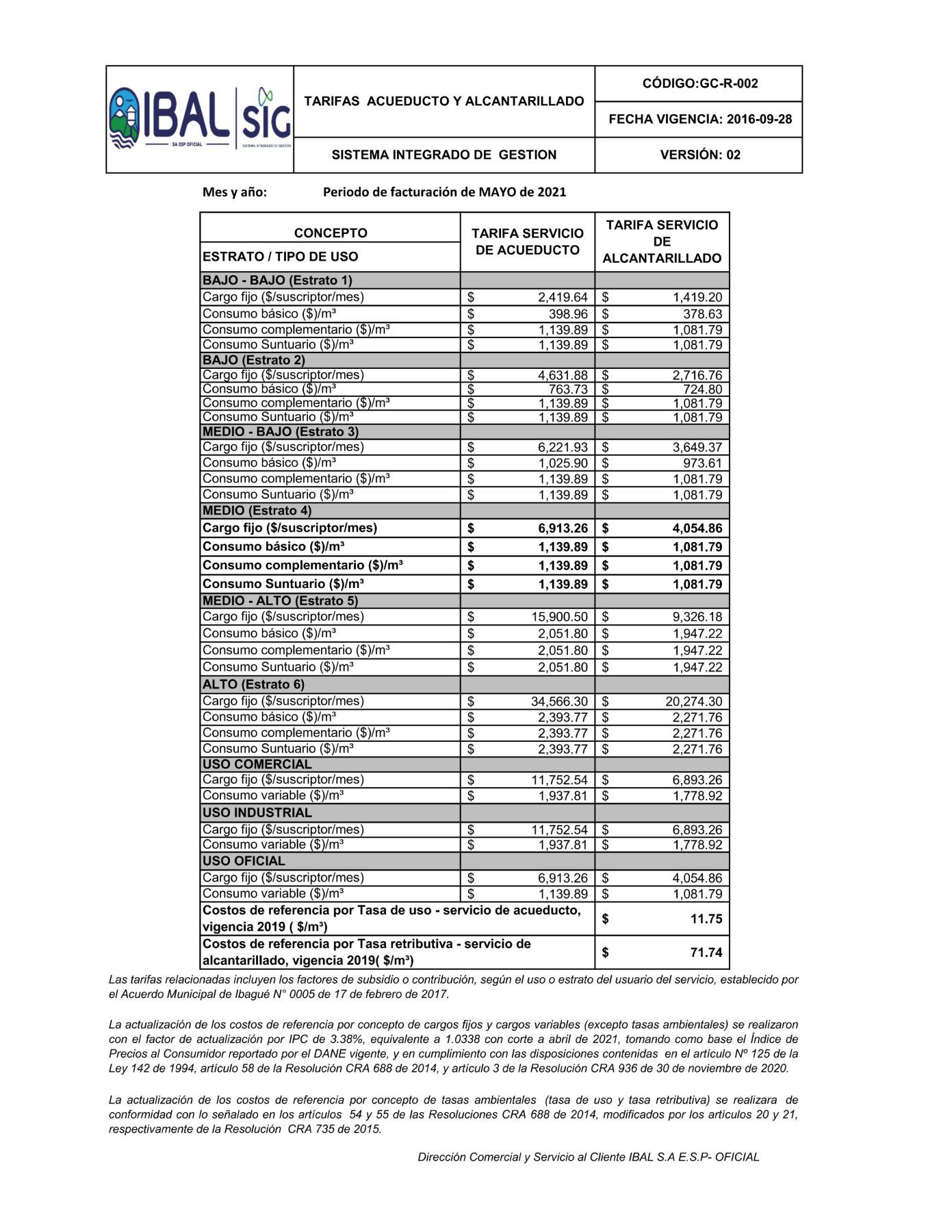 La Empresa Ibaguereña de Acueducto y Alcantarillado IBAL S.A E.S.P. – OFICIAL, en cumplimiento con la normatividad vigente, actualiza a partir del periodo de facturación de mayo de 2021, los costos de referencia por concepto de cargos fijos y cargos variables (excepto tasas ambientales).