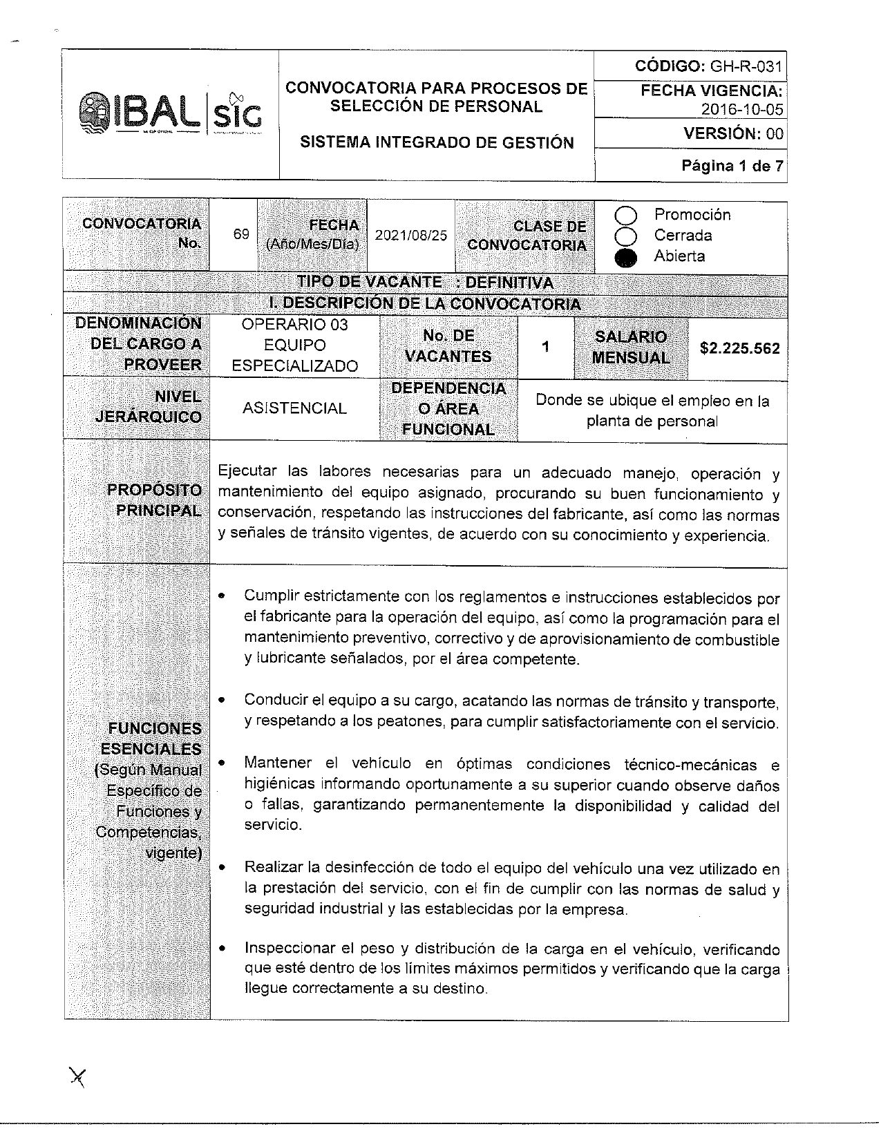 Convocatoria Abierta N. 69 del 25 de agosto de 2021, Denominación del Cargo a proveer: Operario 03 Equipo Especializado, Dependencia o Área Funcional: Donde se ubique el empleo en la planta de personal