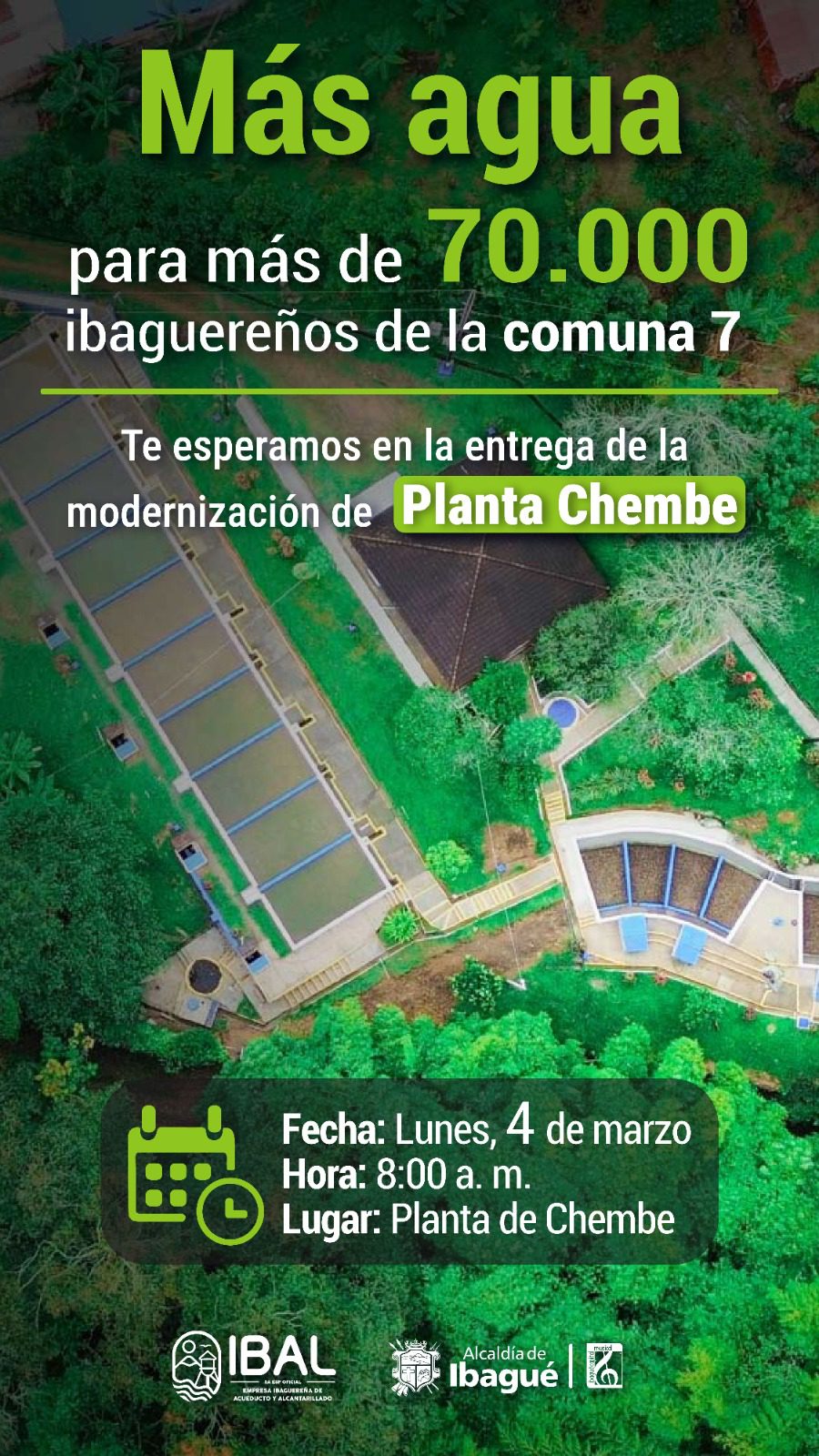 Este lunes 4 de marzo, a las 8:00 de la mañana, la alcaldesa Johana Aranda entregará a los ibaguereños las obras de modernización de la nueva Planta de Chembe, lo que se traduce en una mejora significativa en la prestación del servicio de agua para la comuna Siete.
