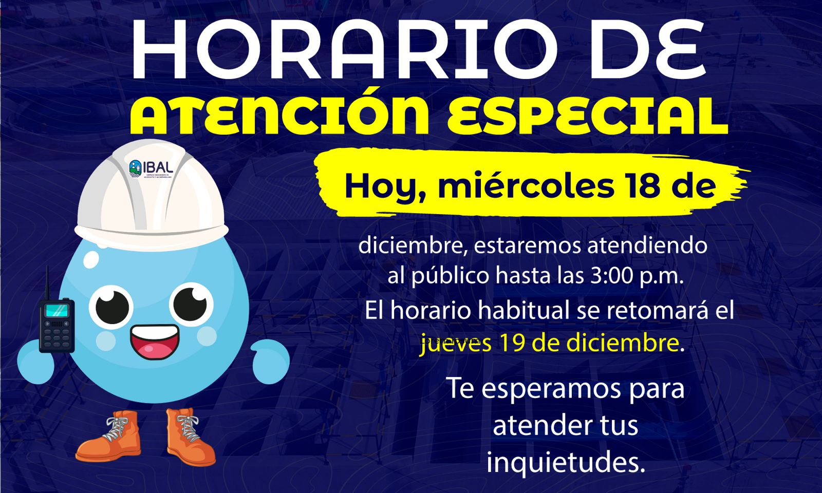 ¡Atención usuarios IBAL! ✍🏼 Hoy, miércoles 18 de diciembre, estaremos atendiendo en jornada continua hasta las 3:00 p.m. en nuestros Centros de Atención Personalizada (CAP).
