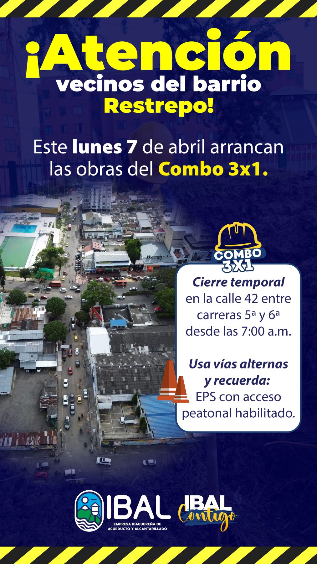 El Combo 3×1 de la Empresa Ibaguereña de Acueducto y Alcantarillado IBAL, regresó con fuerza al barrio Restrepo para seguir transformado las calles de la Capital Musical; por eso este lunes 7 de abril, arrancan las obras en la calle 42 entre carreras Quinta y Sexta, con la renovación de las redes de acueducto y alcantarillado, y la posterior pavimentación de la vía.