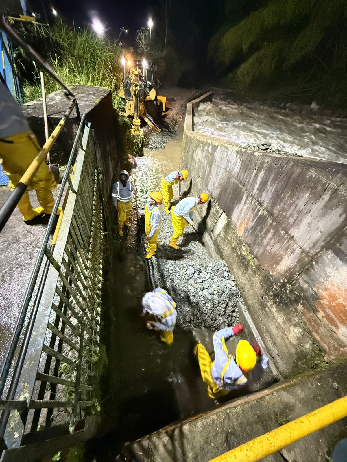 Fabián Tinoco, director Operativo del IBAL, indicó que el equipo técnico se encuentra en la bocatoma, con apoyo de maquinaria amarilla, adelantando labores de limpieza para restablecer el proceso de captación.