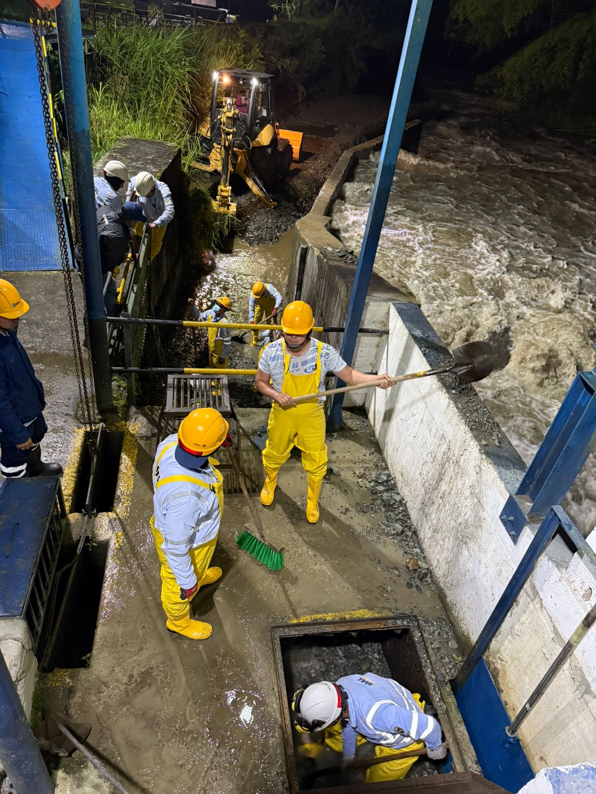 Fabián Tinoco, director Operativo del IBAL, indicó que el equipo técnico se encuentra en la bocatoma, con apoyo de maquinaria amarilla, adelantando labores de limpieza para restablecer el proceso de captación.